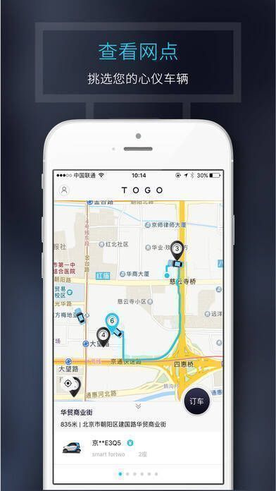 继摩拜单车之后,智能租汽车领域又出现了新成员——TOGO途歌出行,这是一款“智能租赁车”,可理解为汽车版的摩拜单车。它与传统租车公司有很大不同,无需缴纳有去无回的注册费,也不用办理繁琐手续。其车辆大多是奔驰Smart Fortwo最新款,白天和晚上都能尽情出行。和摩拜单车一样,用户只需打开APP注册,寻找附近可租车辆,定位预约,选择离自己最近的网点一键开约。系统还会提示车辆限号情况。选好车后,通过手机智能开门就能开走。除了是smart奔驰,车辆颜值和车内灯都很有型,还有定制版车型。即到即开,随时还车,用完车后不用开回原来的租赁指定点,在任何合法停车点用银行卡、支付宝、微信均可完成付费,而且停车免费,停车费由TOGO途歌出行承担。此外,还有全新五座SUV——东风雪铁龙C3,两款车型能满足不同人群需求。TOGO是0注册费,起步价为1.88元/公里,7:00 - 20:00是0.02元/分钟,20:00 - 7:00是0.28元/分钟,比打车、专车等都便宜。每一台TOGO自由共享车都按时交纳保险金,事故由保险公司处理。目前,在北京各大潮流地标如国贸、三里屯、工体、朝阳门、望京、中关村均有网点。