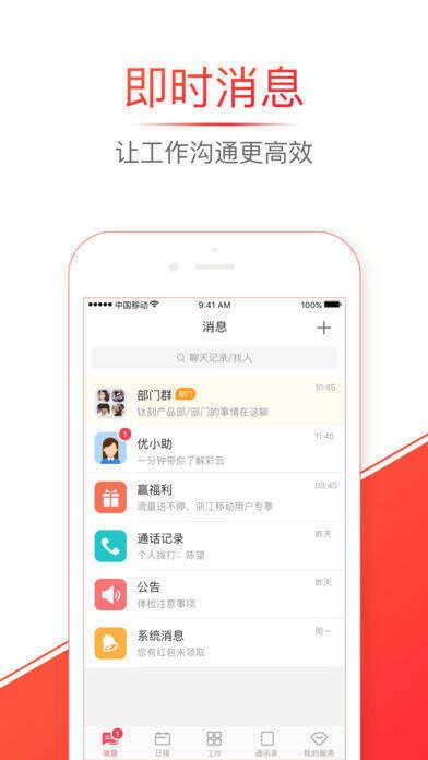移动彩云 iOS 专为大中政企打造,以沟通协作为核心,注重产品细节。它提供可靠的即时消息服务,无需加好友就能与同事在线交流、分享文档和安排日程。其无限云盘存储容量大,方便与同事共享项目文件。