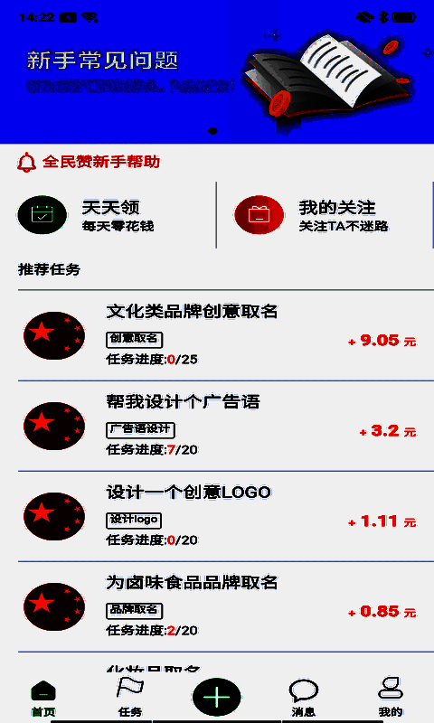 新用户注册可得3元现金红包,完成6项任务即可全部领取。每日完成任务有额外0.5元奖励,还有现金红包。邀请朋友参与,可获朋友完成任务奖励及游戏试用佣金。任务大厅分安卓、苹果及品多多等专区。提现100元以下秒到,100元以上12小时到账。