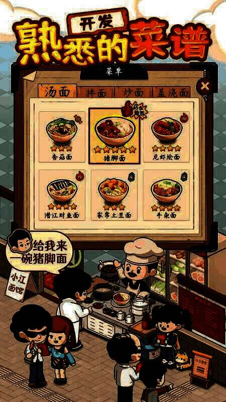 1、游戏中需购置餐桌、进行装修,招聘厨师并研发菜品。
