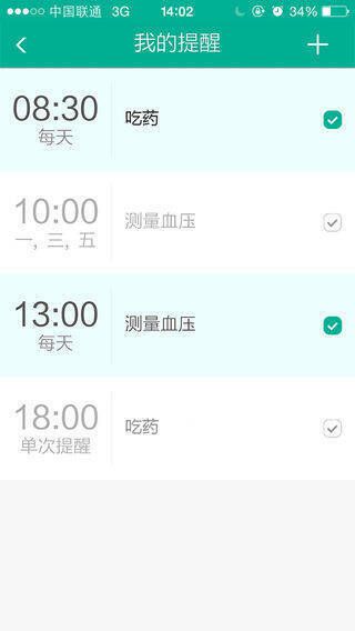 4、闹钟提醒:贴心提醒按时吃药、测血压。