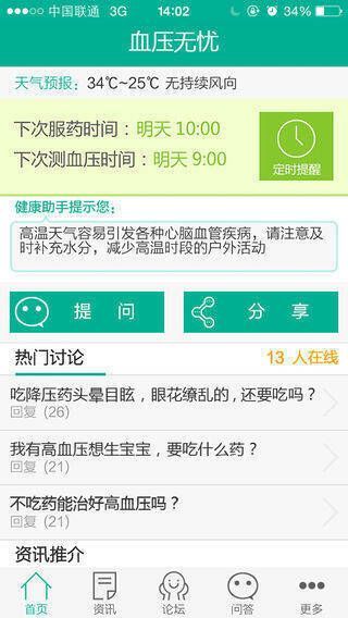 1、病友论坛:与病友探讨高血压治疗和饮食方法,相互借鉴经验。