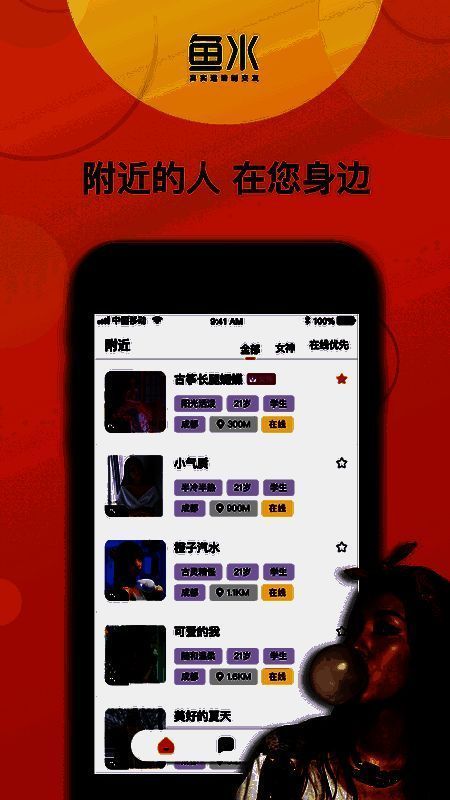 鱼水交友APP是一个优质的交友平台,只要你有交友需求,都能加入其中发现更多有趣的人,它能帮你打发无聊时光。在这里,你总能找到心仪的对象,找到共同话题展开欢乐的线上畅聊。