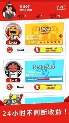 游戏详情:快来成为众人皆知的主播吧!向观众展示你的非凡才能,打造有趣又搞笑的节目。在这里,没有默默无闻的小人物,只要开启直播间、上传视频,终有一天你会成为人人羡慕的知名主播。努力付出,挖掘潜力,整个世界都会为你疯狂!豪华直播间、千万粉丝团、日进斗金都不再是遥不可及的梦想。通过不断点击上传视频,积累高人气与收入,还能升级设备、雇佣助理,加速主播事业发展,收获世界级人气。别再犹豫,开启你的主播事业,这里就是你的舞台!