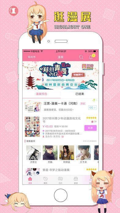 2、有漫展列表展示,能购买摊位、门票,接收活动邀请,分享给好友,关注漫展,还能通过定位获取当前所在城市省份的漫展活动,签到可送积分并进行签到排名等。