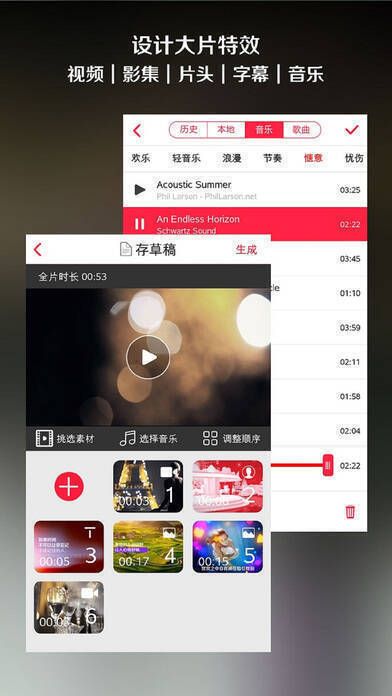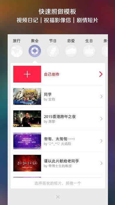 【表达情感,记录生活】众多剧本模板助您轻松入门,您可以制作给亲友的“影像信”、记录生活点滴、创作原创游戏视频等。【一起创作,一起分享】在社区共享剧本和精彩片段,从模仿到创造再到分享,与众多作者共同成长。【电影桥段提升片格】专业摄影师提供海量电影片段、片头、字幕模板和特效滤镜,为原创微电影增色。