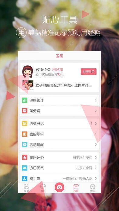 4、别以为不来大姨妈就不需要经期助手。高压痘、经前痛、忙碌肥、情绪瘦、孕前准备、孕后休养,这些可都是姐妹们生活中的重要问题。美荔姐妹聊的大姨妈经期工具能帮你追踪身体状况,准确判断生理健康和预测大姨妈,还有贴心的记账和日记小工具,方便你的生活。