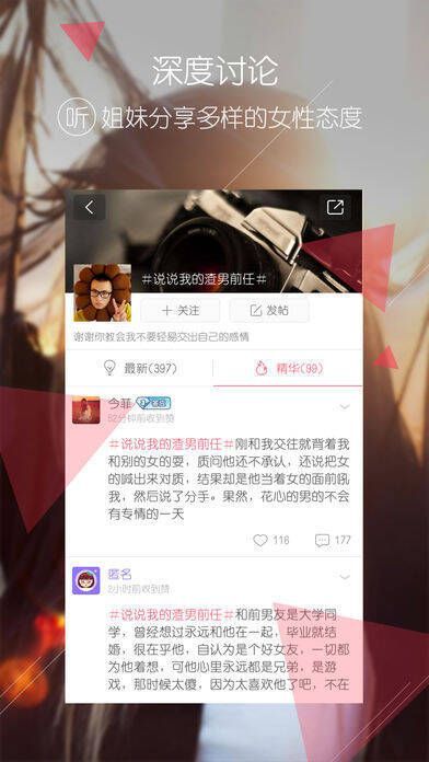 3、美容秘籍、护肤指南、穿衣搭配、美妆心得等,都能晒给姐妹们看。随时分享美丽秘诀,还能记录自己的变美历程。受姐妹们喜爱的好帖子,分分钟就能置顶热门。美丽,就在美荔姐妹聊。