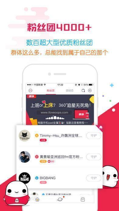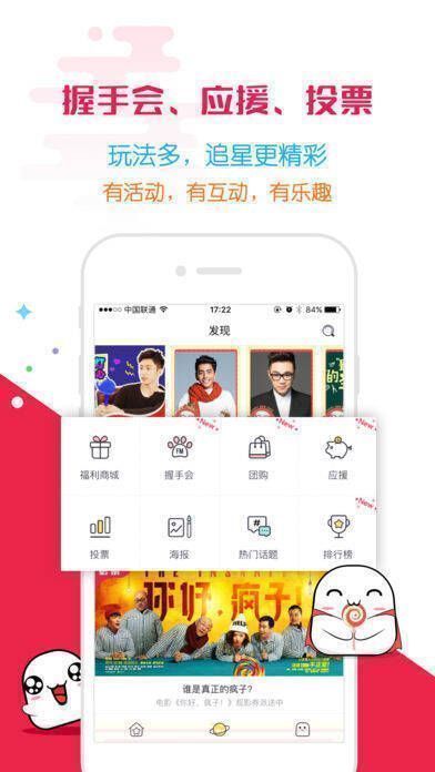 一款集精彩线上线下活动(如粉丝见面会、握手会)、粉丝团应援、投票、互动、独家粉丝福利、周边、演出票、明星资讯美图视频资源等于一体的粉丝交流互动平台(APP + 网站)。具备便捷强大的粉丝团管理、应援活动饭制商品发布管理、宣传海报制作等工具,助您轻松组织粉丝应援活动、制作分享爱豆精美宣传海报,还有不定期明星握手会,快来开启愉快追星之旅!