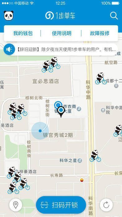 在线预约1步单车:打开1步单车app首页,可查看附近1步单车的位置及周边单车数量;若想使用某一辆,在屏幕上点击它即可完成在线预约。