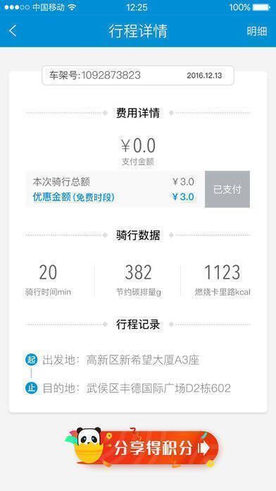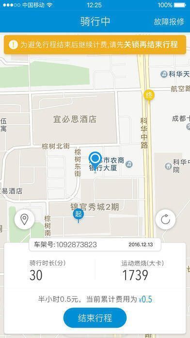 到达目的地停放车辆结束用车:到达目的地后,自觉将车辆停放在不妨碍公共交通且他人易找到的位置;停放好后按下键盘锁复位键,再锁上车锁;最后打开app,点击“结束行程”。