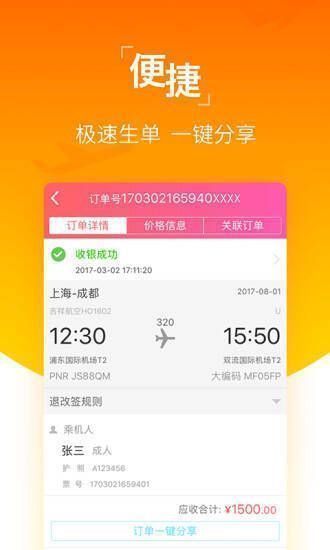 1、实时追踪订票业务;2、可在线提交退改签;3、能随时关注重要订单;4、无需携带钱包。