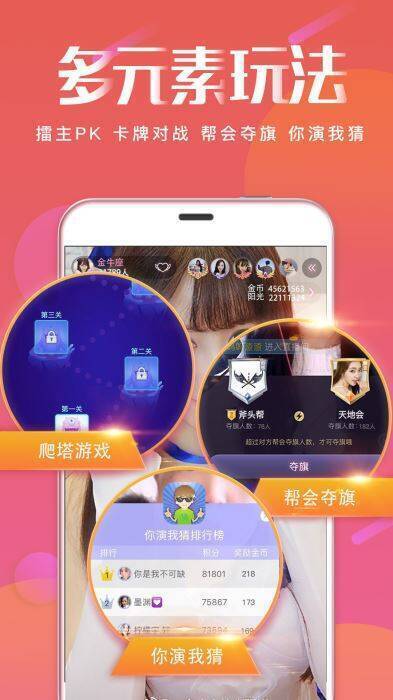 4、多元素玩法精彩纷呈,擂主 PK、卡牌对战、帮会夺旗、你演我猜等;