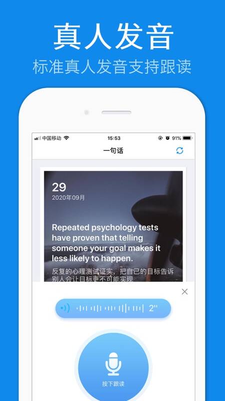 1、英语一句话,每日精选一句,真人发音,坚持学习,每日进步。