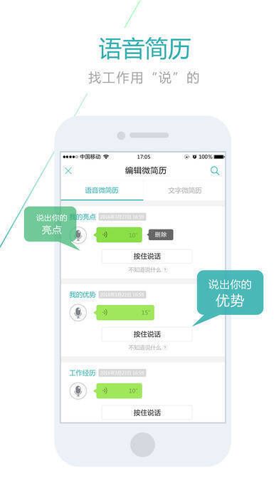 【语音简历】说出独特的自己;【直连沟通】与Boss畅聊入职;【数据驱动】大数据懂你;【智能匹配】快速锁定合适高薪岗位。