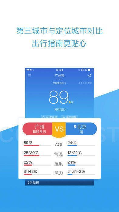 5、城市对比:这是出差、旅行的实用功能,能快速对比异地城市和当前城市的天气与空气差异。