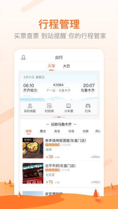 火车到站提醒、一键叫车、在线买票、目的地攻略、酒店、美食、周边游等,一应俱全。