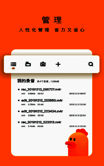 各位好,我是《录音鸡》,堪称录音界的“战斗鸡”,是一款极为实用且高效的手机录音工具。它相当出色,用户在学习时能录制重要知识点,会议中可记录重点内容。操作极为人性化,如同傻瓜式一般,让你轻松上手录音;管理也十分人性化,管理录音既省力又省心。