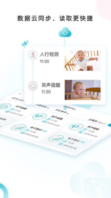 数据云同步,存储与读取便捷,还有可选增值云服务。能在线管理和存储宝宝各类数据,不同手机可随时随地读取、下载,无需等待,快速回看,带来流畅体验。