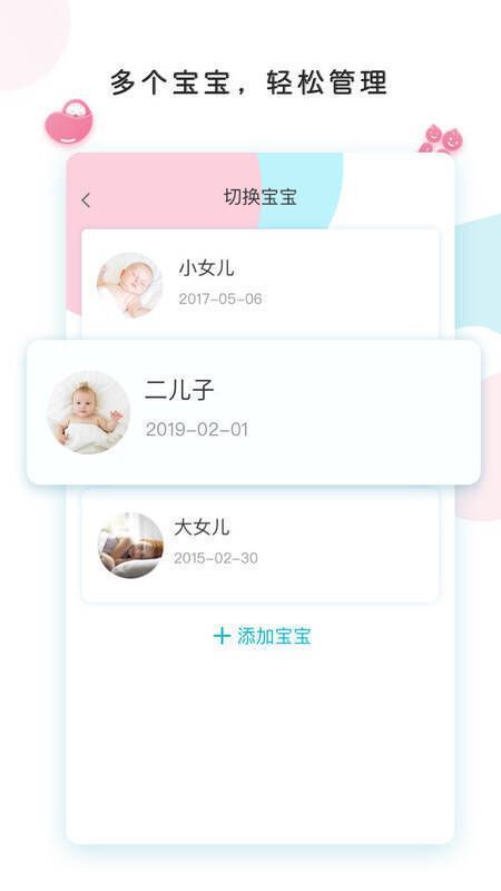 多宝轻松管,若家里有两个及以上宝宝,ebemate app支持创建多个宝宝档案,分别记录不同宝宝的成长,让每个宝宝都能得到同等关注。