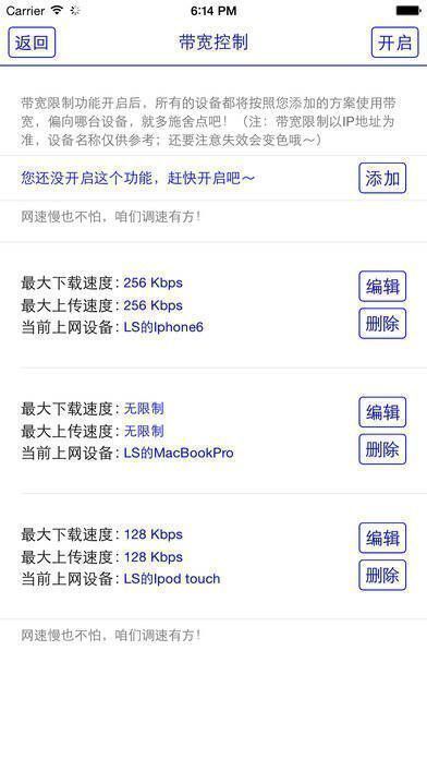 1、开启网速控制功能,管理设备网速,让你心仪的设备享受最快网速。