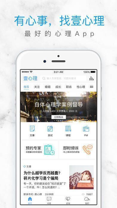“壹心理APP”,作为国内最大的综合心理服务平台,你能够在这里阅读心理文章、进行心理测试、学习心理课程、收听心理FM、提出心理问题并预约心理专家。国内外5000多位专业心理咨询师会为你解决生活中的各类心理问题,还有千万网友在平台上免费回答你的提问,陪你一同成长!