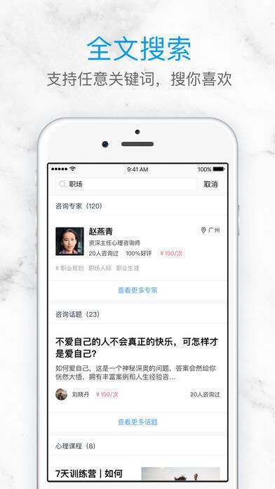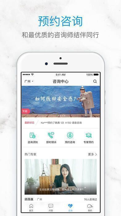 3、预约心理咨询:通过提供城市、价格和咨询方向等多维度的智能筛选,为你找到靠谱专业的心理咨询师,直接在线预约和支付,就能享受一对一的语音、视频或面对面咨询服务;