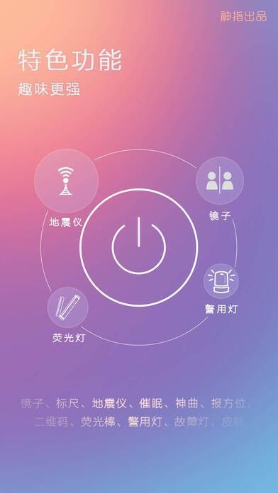具备地震警报、安全防狼、报方位、显示海拔高度经纬度、炫彩灯、指南针、标尺、安神催眠、镜子等功能;启动速度快,设计精美,是首款按照IOS7风格打造的手电筒应用。