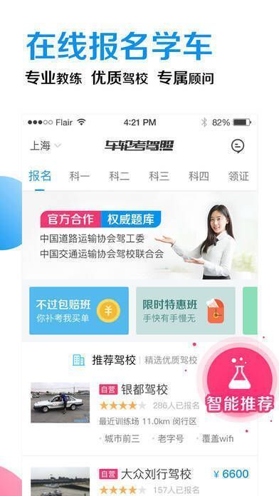 2、流程全面:从选驾校、报名,到理论模拟考试、科目一、科目二、科目三、科目四,再到新手上路,超全的考驾照流程,一个app就能全部搞定。