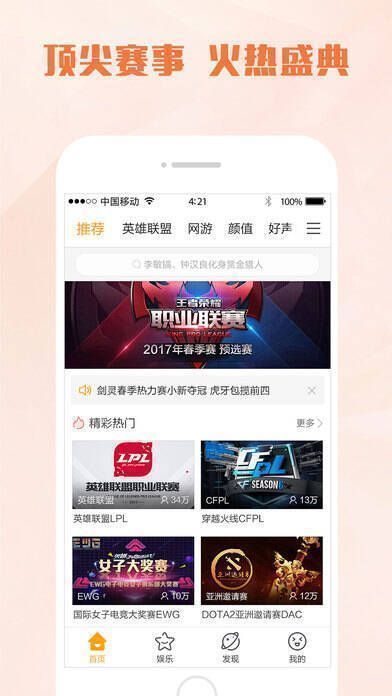 4、平台汇聚众多世界冠军级签约主播与战队,如国民电竞女神Miss、中国英雄联盟首个世界冠军诺言、英雄联盟S4 - S6国服连续三年第一的Dopa、王者荣耀天才少年嗨氏、lol全明星solo冠军小狗。