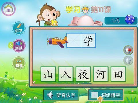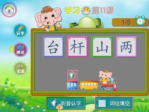 5、词组测试:当学完一组汉字后,会给出词组测试以巩固识字效果。