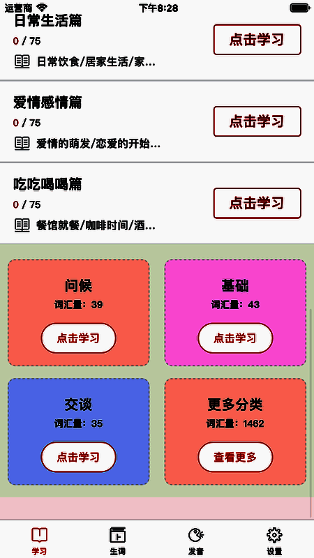 1、可查看丰富词汇,涵盖问候、交谈等分类,更多分类待你探索;