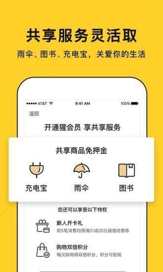 4、会员特权惊喜多:成为猩会员可返还100元会员红包,购物能享双倍积分,共享租借免押金(仅限开业活动期间)。