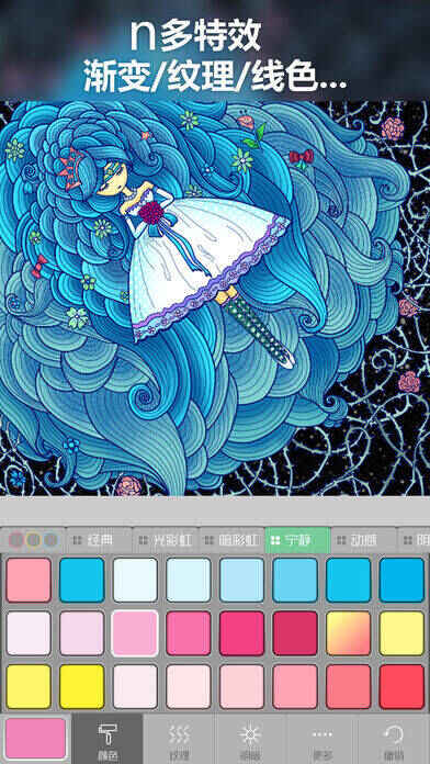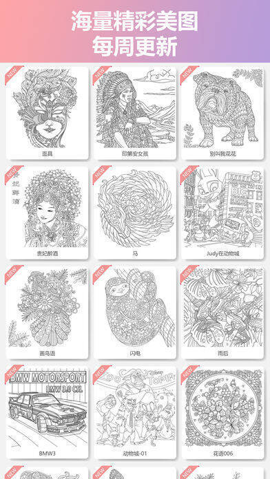 除了常规的涂色玩法,它拥有众多同类 APP 所没有的特色功能:数百种图画、纯色、渐变色、纹理供你自由发挥,全民都能在涂色中成为艺术家。