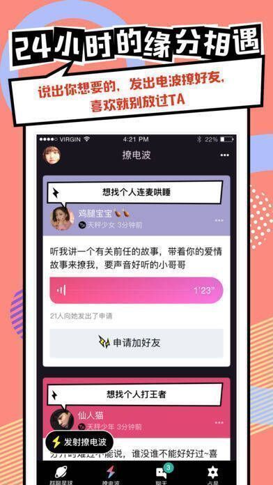 发出电波,相当于开启邀请好友申请的通道,该通道24小时有效,能让更多有趣的人关注到你。在无聊的碎片时间里,到撩星系回应他人的电波,结识更多有趣的朋友。
