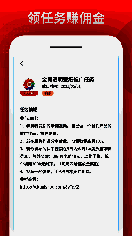 它是一款可靠的短视频分享软件,每日有大量任务等你完成。不仅有海量高质量短视频资源供你随意观看,还能让你在线分享喜欢的视频,完成任务可获丰厚奖励,边看视频边赚零花钱,想找兼职的朋友不妨一试。