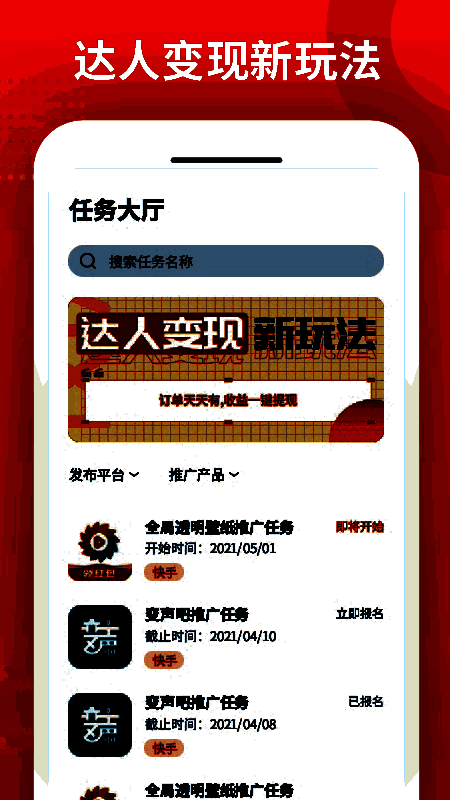 1. “红人直推”模式下,人才可直接报名商家发布的任务,快速实现短视频变现。