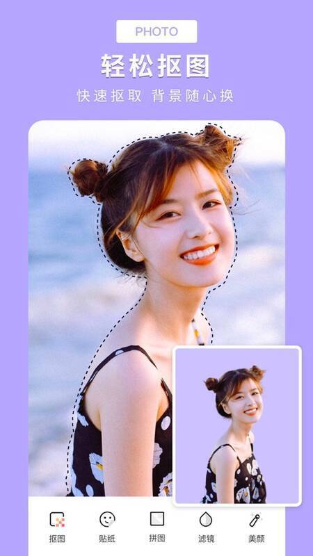 1、轻松抠图,能快速抠取背景并随心更换,还可在线挑选好看壁纸作背景。