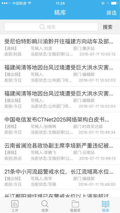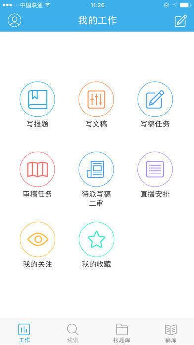 【我的工作】记者和用户能在线完成选题策划、稿件制作、文稿审核评定以及查看直播安排等采编工作。
