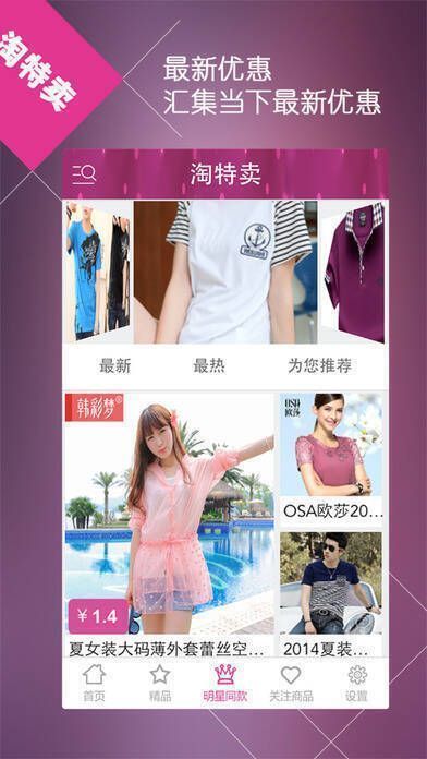 最新最热门的特卖商品,尽在《淘特卖》!《淘特卖》整合了全网最为全面的特卖商品资讯,其APP服务团队精心筛选,为您带来别具一格的购物体验。软件界面设计新颖潮流,操作便捷易懂,是您进行网购团购的绝佳之选。