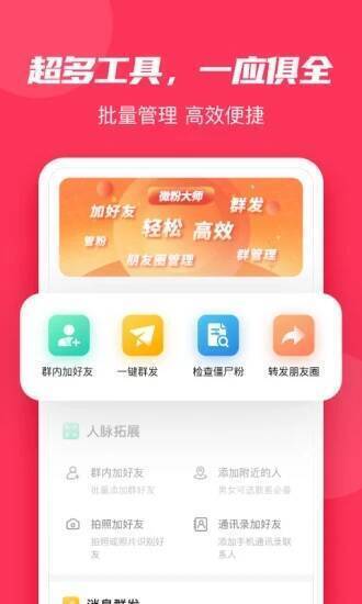 1. 具备全面的微信管理功能,涵盖清粉、检测拉黑好友等基础功能,还有消息群发、自动转发、人脉拓展等高级功能,满足微商多样化的微信营销需求。