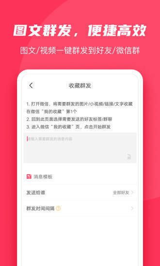 1. 消息群发直达,可直接群发给微信好友和微信群,支持不同群发方式,实现精准营销,且有图文消息、亲密群发等形式。