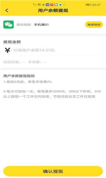 3. 提现便捷:达到2元起每天可提现一次到微信或支付宝,每笔最高2000元,提现速度快,200笔以上提现一个工作日到账。