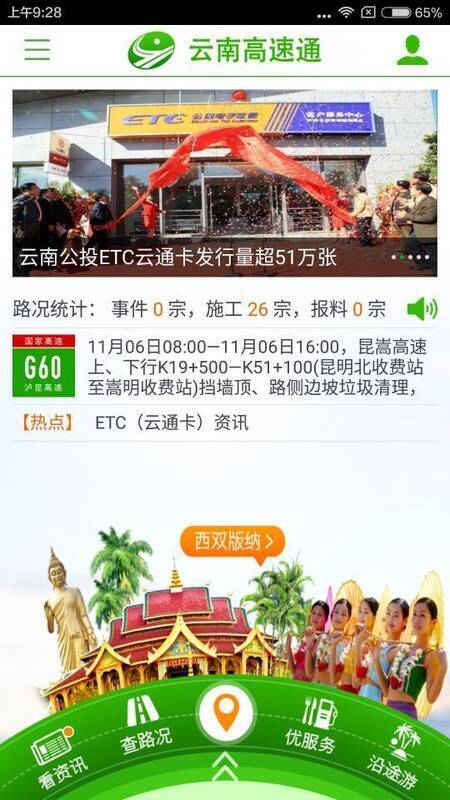《云南高速通》APP 整合了云南省实时路况、高速服务设备信息、路况导航、路费查询、路况报料等高速服务查询功能,为公众出行提供准确、便捷、个性化的交通信息服务。它能为市民走高速提供实时路况和服务信息,让春节走高速更顺畅,寻找美食更高效,不再因拥堵而焦虑。进入 APP 点击“查路况”,全省高速路况简图让您对全省高速路况一目了然。