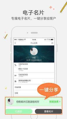 下载安装汇智能通软件,可制作精美的电子名片,并通过网络发给业务往来的客户、公司和朋友。如需更改已发名片信息,在手机上改动后,名片信息瞬间更新,让客户第一时间了解最新工作环境和联系方式。