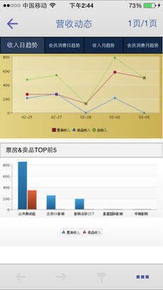 1、为影院提供营收、票房、卖品、会员的实时分析报表。