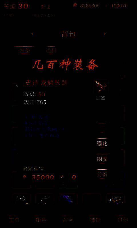 1、拥有几百种装备,可进行强化、附魔、打造、合成等操作,最强力的神器装备需通过刷怪掉落。