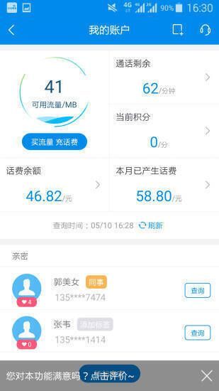 - 能为亲密之人管理话费,添加亲密联系人后,实时掌握其流量和话费剩余状况,让连接永不中断。