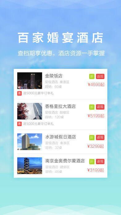 1、婚宴酒店:平台汇聚上万家婚宴酒店,有海量酒店案例,让您足不出户就能360度全方位了解酒店情况。