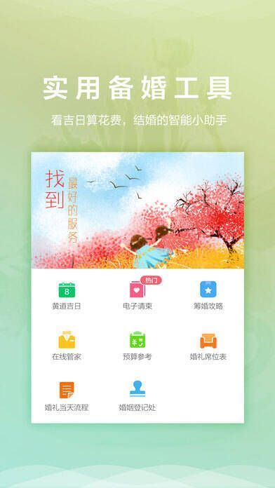 结婚乐秉持轻松筹婚、快乐生活的理念,打造一站式婚礼服务平台,涵盖选婚宴酒店、租婚车、选婚庆、查看真实婚礼案例、找司仪、化妆、跟拍、摄像等全方位服务。